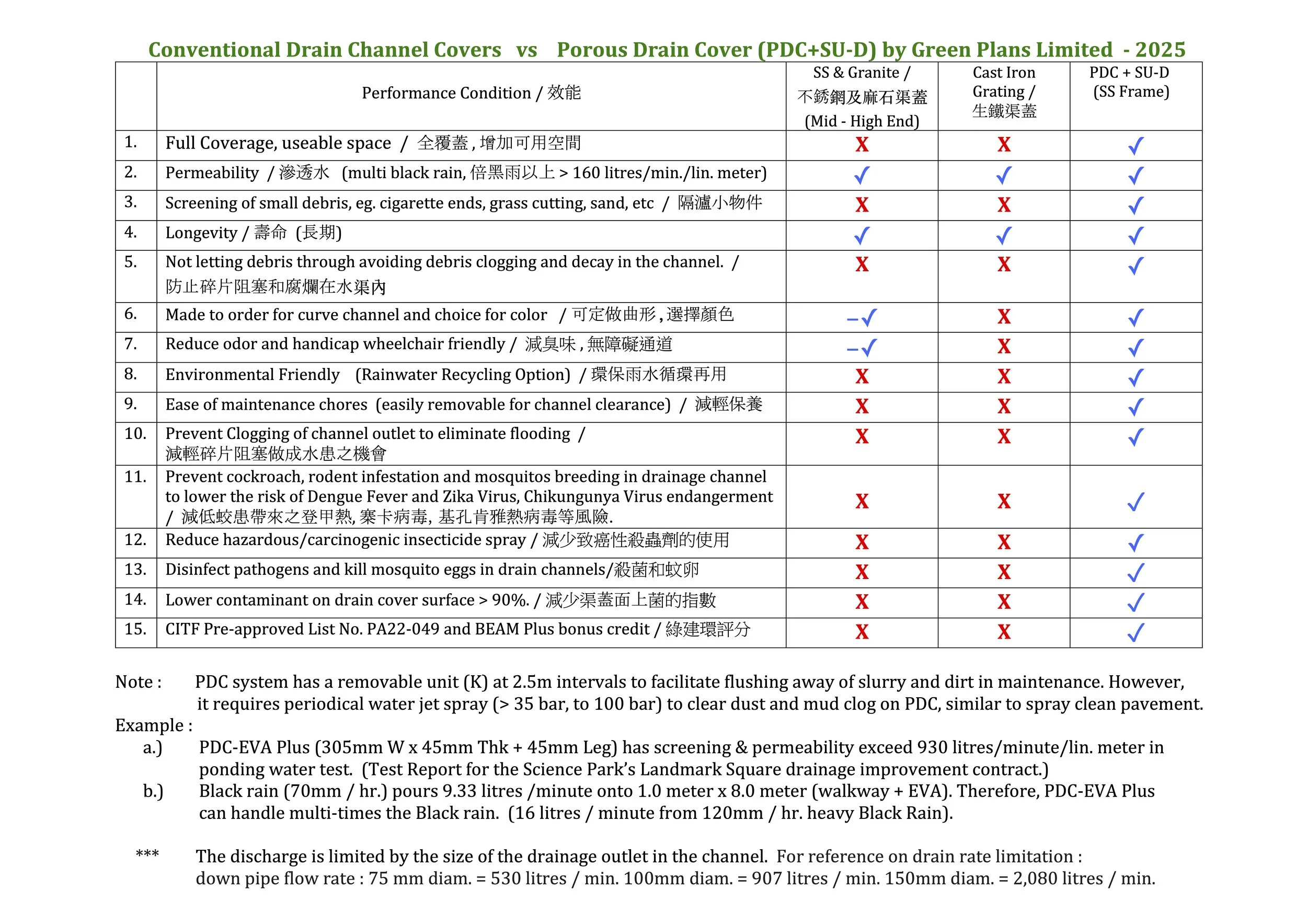 (debris small as 3mm size) while providing permeability > 120 liters/minute per 500mm x 380mm x 50mm thick of PDC block for heavy duty application or equivalent by surface proportion ( or 1.2 liter / second over 175mm x 280mm x 22mm thick PDC ).